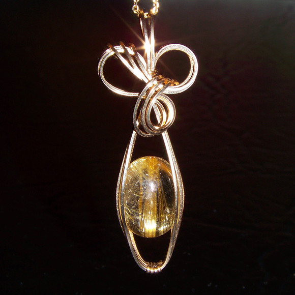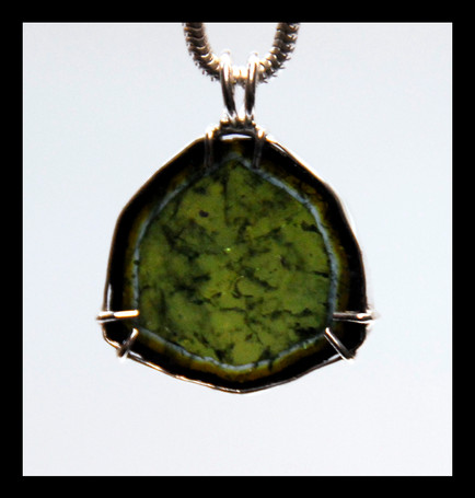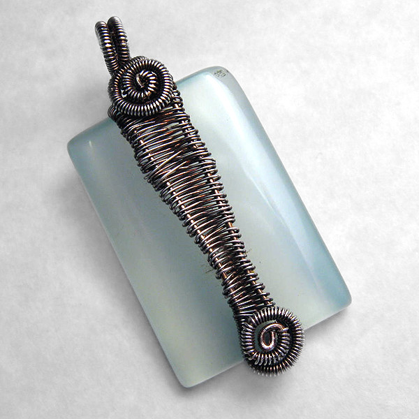 - A wire-wrapped pendant of dichroic glass