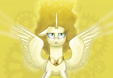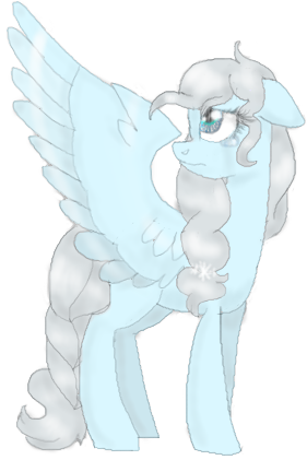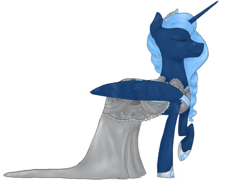 If you look at the raised hoof carefully, there’s a snowflake. And I did the fancier type of eyes this time, and a bit of mane shading. You can’t see the mane shine very well, because her mane is near-white. I tried to make the sparkly part of the dress, but all I can do for sparkles is the glowy dots.