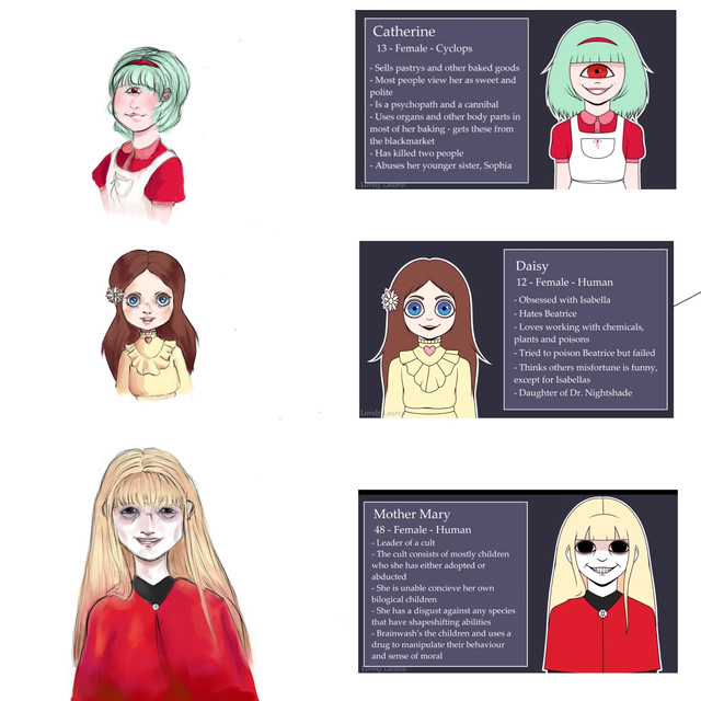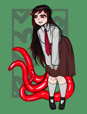 Her character is fairly new, but her backstory is basically done. In short, she has gone to as fancy academy somewhere in the countryside and had a secret relationship with her teacher. After he cheated on her, she ran off crying and absolutely devastated to the nearby cornfield and then found this slimy cube looking thing that attacked her and attached itself into her body. This caused her behaviour to change and she soon started plotting revenge angains her teacher with the help of this alien parasite.
