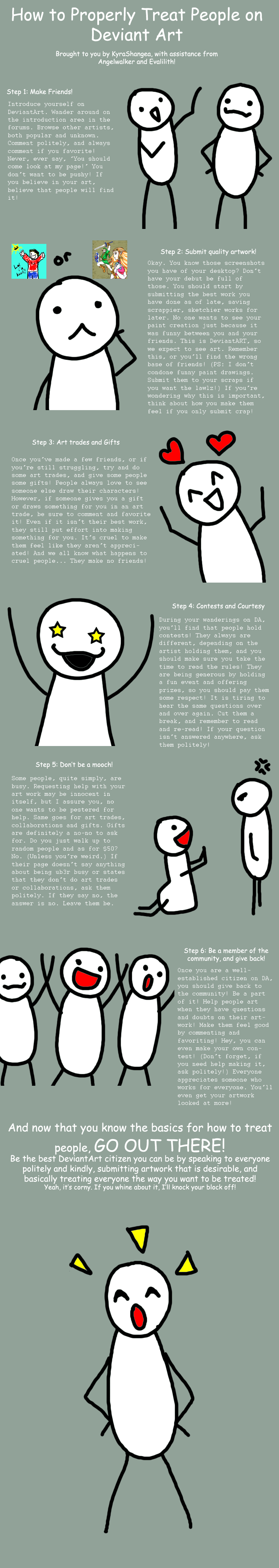 I really don't consider this very funny, kinda funny to an extent, but in all honesty; it's more aggravating to us already a Deviant people. But never the less; useful and informative. DeviantART should really put a link for new deviants to these before putting their info. Especially this one. I read another "Guide To DeviantART" a few months ago, but it was more of a joke.