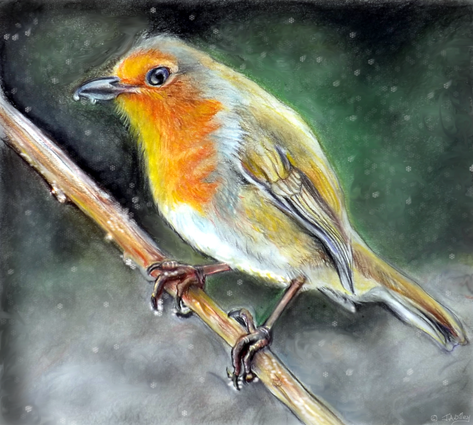 Drawing a Robin, coloring with Pastel sticks and pencils on paper.