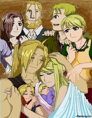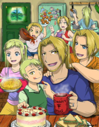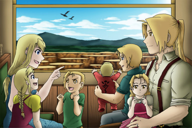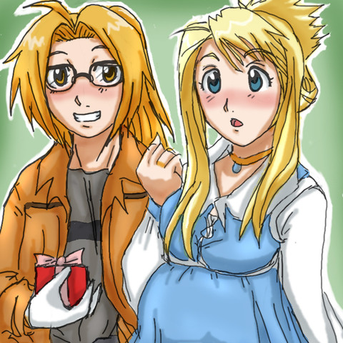 OK Yeah, this isn't the "Father's Day" picture but I figured that since I was technically updating in May (since the "Mother's Day" picture), I should just get those pics out of the way. I originally made a picture for 503 day (EdxWin day!What I interpret in this picture is that Edward's trying to "pre-educate" their baby by teaching it alchemy while it's still in Winry's stomach. However, mommy doesn't want it to end up turning into an "alchemy freak" like daddy so she's attempting to confiscate the book. In my mind, they will never change.