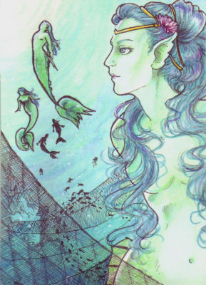 Beautiful drawing! Would that be a narwhal mermaid in the back?