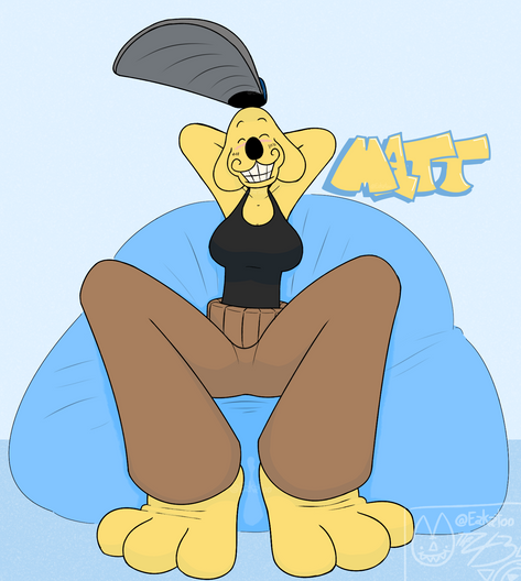Nice artwork of Barefoot Patsy Smiles (shoes off) sitting on a bean bag chair Amidnarasu.