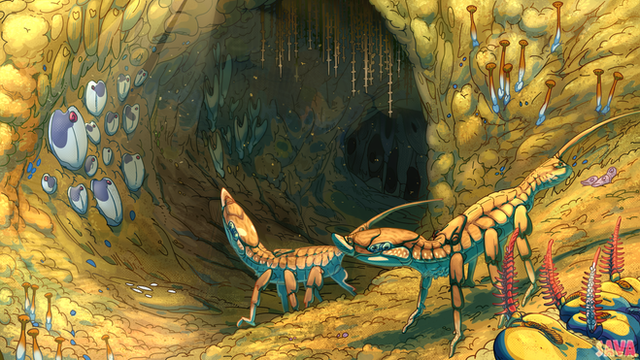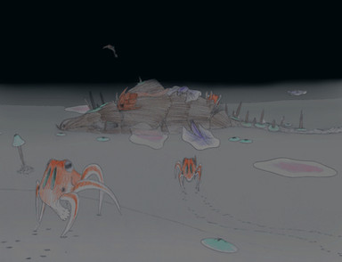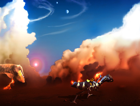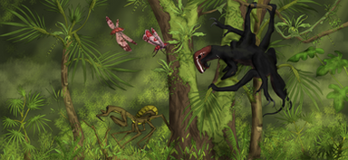 A pair of sinister polycephalids crouch among the supporting struts of a derelict canopy, watched nervously by a distant grazing herd. Tiny photosynthetic aeolis flutter weakly in the sun, a sparse remnant of the vast colony that inhabited the living canopy. Another canopy looms on the horizon.ΒSinisters, named for the unique position of the killing head on the left side of the body, come from a large and successful group of asymmetrical polycephalids (thought to form a clade with the other asymmetrical polycephalids before the discovery that asymmetry had evolved many times on Tath). The left head specializes in capturing and restraining prey, while the right is ferociously exaggerated for killing and dismemberment.Β