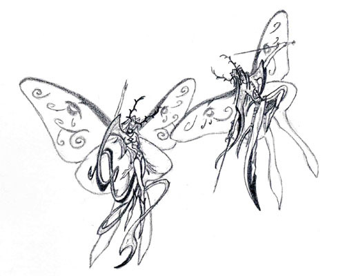 Okay. I'm impressed. I really enjoyed noticing all the little details, like the grasshopper, heart charm, and skull in the tree, and the hint of her boots almost hidden in the swirl of the cloak. Will you design some clothes for me? I would pay for a cloak like that. Or a kimono. You could get some silk and hand paint the design. That would rock.