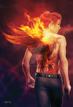 hehe I recognize this pose. I like the light of the face, the eyes and firey hair are drawn in a way that makes the picture come alive.