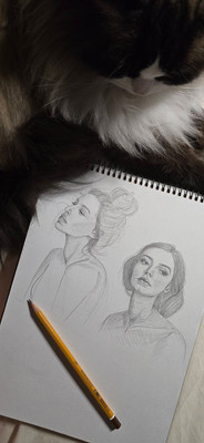 Ink and coloured pencil drawing of a tortoiseshell cat.Related content