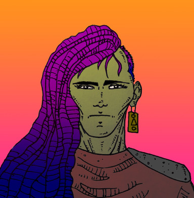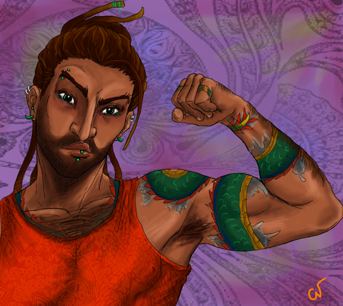 There is an Afro-Latino man with golden skin and red hair in braids. His eyes are the same color as his shirt is, and he has several silver piercings on various areas of his face. The background is black with pink blood splatters.
