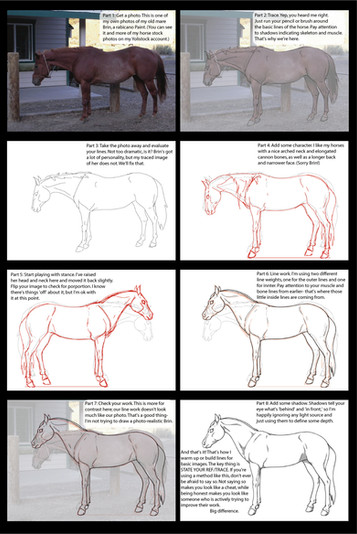 It might be helpful for you to first take the same reference I used and try to 'copy' (not trace but try to reproduce) the example I have done here. It might help you learn. While it is not usually acceptable to copy other artist's work I give you full permission to do so with this tutorial- as long as, if you post it, you link back here.