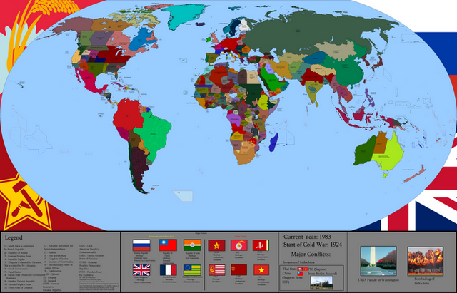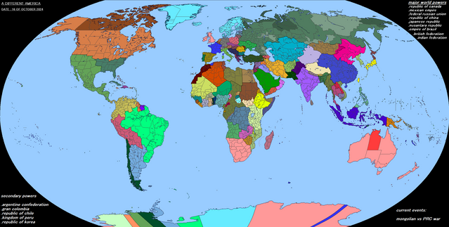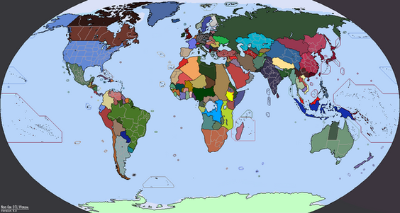 Britain has created an Imperial Federation with its Dominions, each of which is equally represented in the various Federation Councils[4]; Britain represents the remaining colonies by proxy. South Africa has absorbed Bechuanaland, Swaziland, Basutoland and South Rhodesia; Newfoundland is still separate, and includes St. Pierre and Miquelon; Australia also includes Papua and New Caledonia; Ireland became a dominion peacefully; East Africa was settled by large number of Jews following the Balfour Plan; and India was divided into six dominions, though they also operate cooperation meetings between themselves and the Princely States.