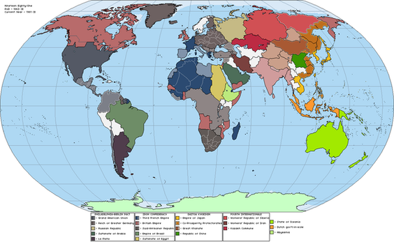 But, lest we forget, the world isn’t merely divided between the Anglo-Japanese alliance and the Berlin-Vienna Axis. The various Fascist powers may lean more towards London than Berlin, but they still maintain independent policies. And, of course, there are innumerable countries not aligned to either Hegemon…