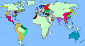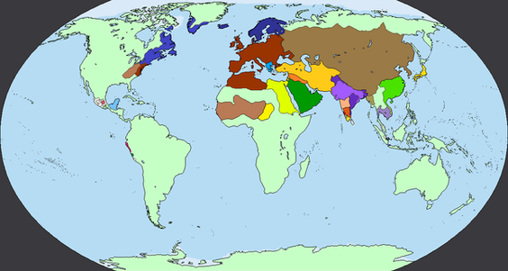 Map of the world (1938) in Her Diamond Heart.Pale green is almost uninhabited. Pale gray is lightly settled/pre-state societies.