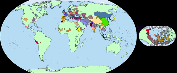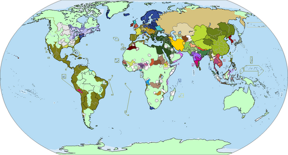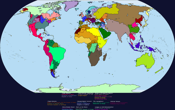 Map of the world in 2070.The brown-ish coloured country in South Asia is the New Khanate. Areas in white are not under the control of their respective governments. Areas outlined in red are rebel-held areas which cross international borders