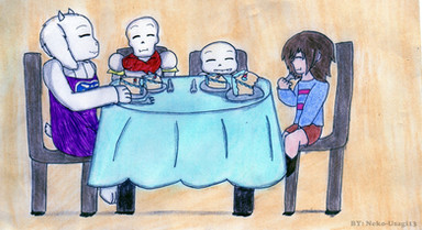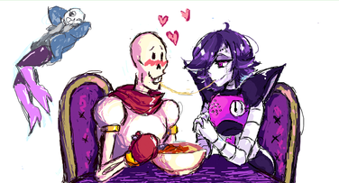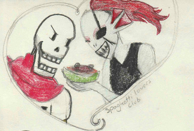 Ahh this is ADORABLE! I have seen Undyne and Papyrus sharing spaghetti before but all the extra touches really make this pocture. I really love it and I'm glad there's more Undyrus art out there.