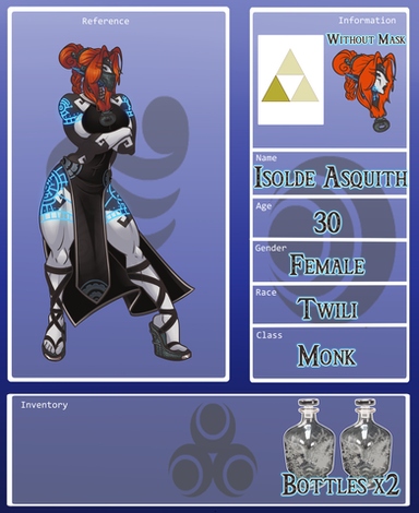 Personality: Ru tends to not be the brightest crayon in the box. However, what he lacks in intelligence, he makes up for by being charming. Ru can talk his way in and out of just about any situation....unless he is dealing with his travel companion, Velaris. He has an extremely bad habit of spending his rupees, and Vel's, on alcohol and things to woo attractive men and women.