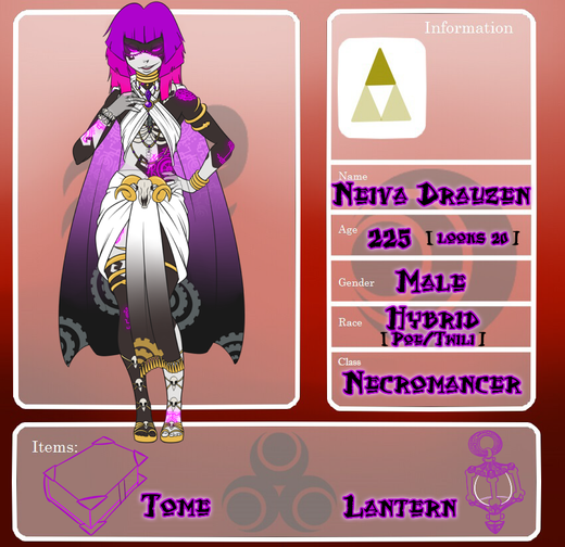 At some point in his childhood, Ru met a young Sheikah named Velaris . The young woman was reckless and wild, often running amok in town and often breaking things in her wake, or injuring herself in the process. Her behavior intrigued the Rito-hybrid, as she seemed like quite a bit more fun than the chores he did daily. After a few fairly awkward encounters, the two became unlikely friends. Velaris, despite being reckless and impulsive was otherwise quiet, loyal and generally uninterested in others romantically. While Ru was loud, demanded attention of the people around him and would flirt with about anything with a heartbeat, a trait he had likely gained from his Gerudo mother. Despite their differences, the two were inseparable.
