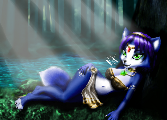 I like the lighting in the background.Β Besides being picturesque, it's good contrast to the color scheme of Krystal's fur and clothing.