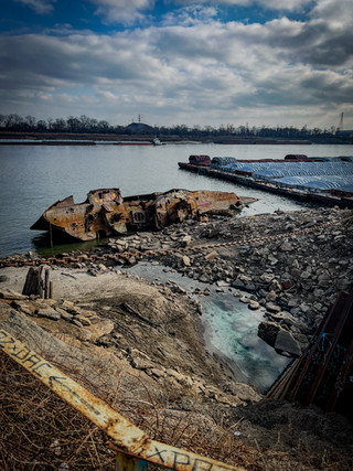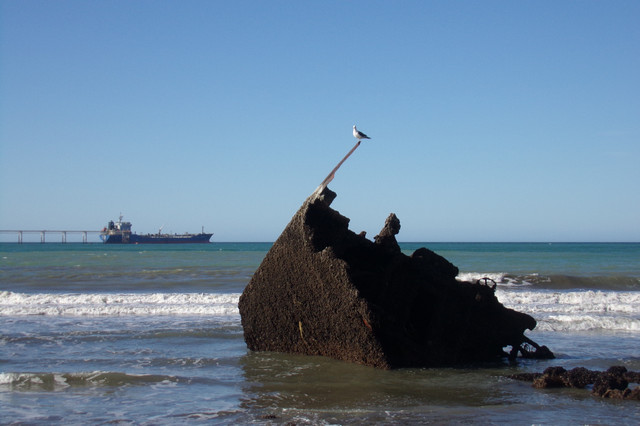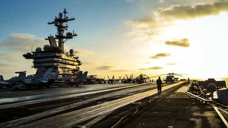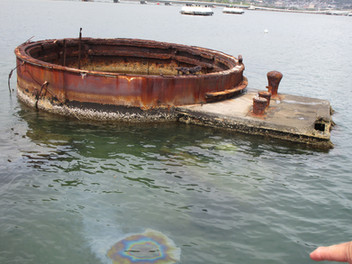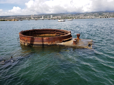 This is a photo of the USS Arizona's smoke turbine peaking from the water at the Pearl Harbor Museum in Honolulu, Hawaii.The weather, water and sky were all on my side that day when this photo was taken. In the background, you can see the contrast of age and technology with the mighty USS Carl Vinson, a Nimitz-class supercarrier, moored at the Pearl Harbor Naval Base.