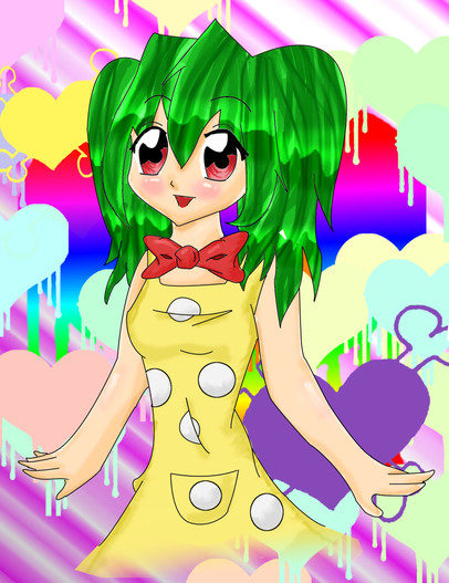 So cute! =] You drew her smiling so adorable I think. She looks really cute. ^^ Oh and I can't help but loving those hearts as well for some reason. X] Green and pink! <3