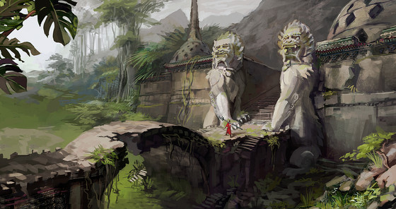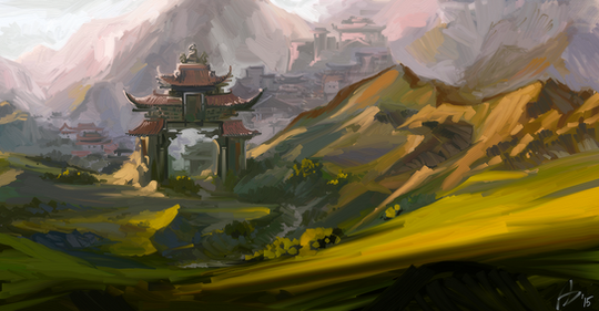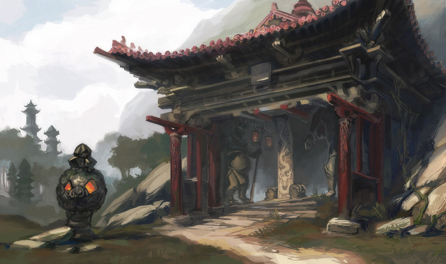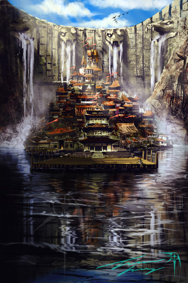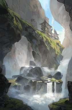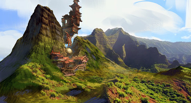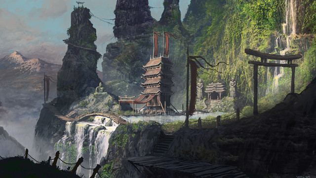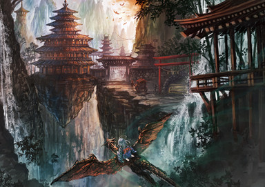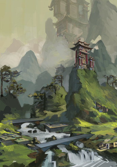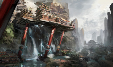 #china #dragon #mountains #ravine #river #temple #village #waterfall