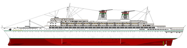It is believed that the final plans for the ship had her at a whopping 1,050 feet long with a beam of around 100ft! Had she been built, this would have made her larger than the Queen Mary and the Queen Elizabeth (both were around 1,030ft) at the time!Β