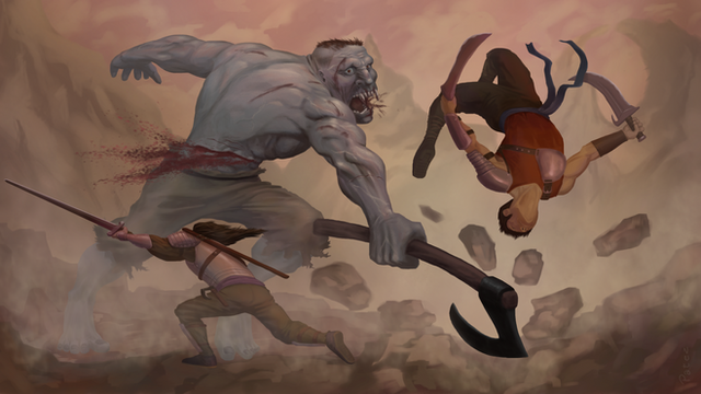 Two days out from Billett's Rise Phaia tracked down the ogre's responsible for the merchant raids. The ugly creatures were too busy arguing over their spoils to notice the elf hiding amongst the boulders on the ledge above as she readied her axe.The dark haired ogre stomped backwards and forwards across the clearing as the argument intensified, eventually coming to a halt directly below Phaia. Seizing her chance the elf dropped from the ledge and landed on the monsters shoulders and wrapped her legs around its neck. It yelped with surprise as she grabbed a handful of thick ogre hair and wrenched its head back with all her might.