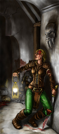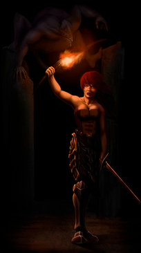 Her sword looks old,like it has seen some action, and exposure to the elements. The lighting of the torch is very realistic,only showing what would be visible with such poor lighting.