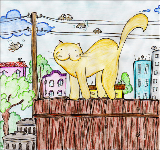 Oh my gosh, what a cute idea! I love the contrast of the bright orange cat with the turquoise sky! It looks like he's bending the whole telephone pole over with his weight xD Great job on the fur details, and I especially love the blue shadows you threw in there! This makes me grin