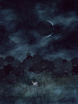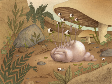 Bizarrely cute... The huge multiple-eyed creature seems to gently embrace the little worm. I thought the little blue thing was a dragon at first sight. Amazing work!