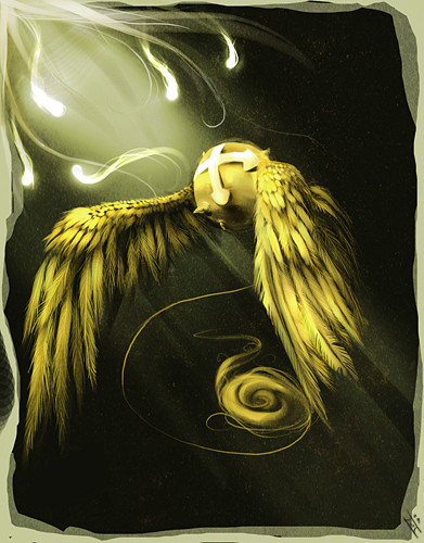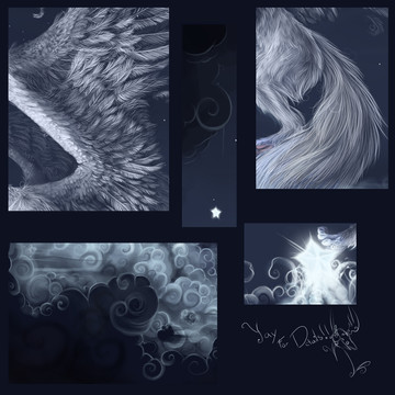 Amazing wings you have!~ I love the very calm expression on his (?) face. the clouds are really cute ^^... do you mind me asking what kind of tablet you use? (if you use a tablet. if you dont then... o.O thats scary good... not that its not scary good already... xD)