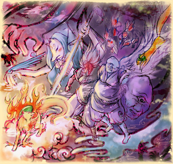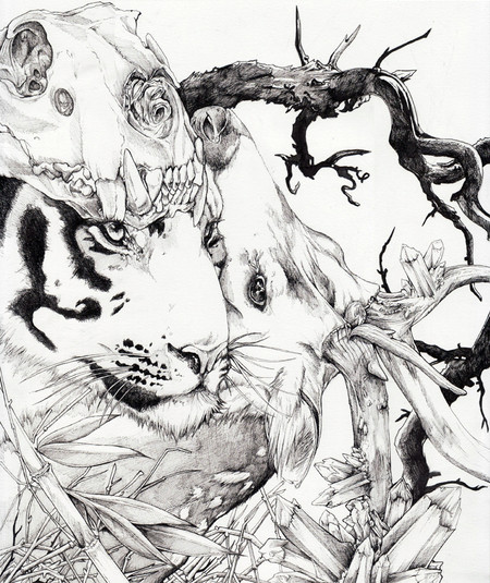 i actually really like this in black and white! not that i wouldnt want to see it colored, of course, but i really like your black and white stuff because its so like...mystical and shit. even your little dog sketches have this fancy layer of blur magic that i really, really like! (i know my description of art terms is awesome dont laugh) ANYWAY i really enjoy the characterization of the tiger's face in particular! and the little monk is so great! i also really like the flow of the whole thing, and how i keep finding new little animals to see!
