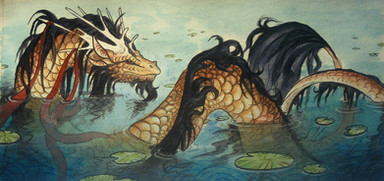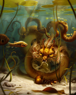 This is lovely; if Arthur Rackham was Chinese, he may have done something like this... I really like how the curves of the dragon are echoed in the lily pads, water, the dragon's mustache, etc. I also like how the light source emanates from the center; it keeps the frogs from getting lost! Too bad I live so far from LA!