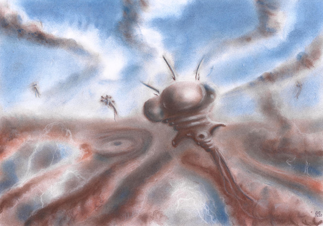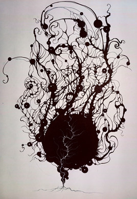I can't tell exactly what I had in mind while I was doing this. Maybe something organic, something liquid and free and flowing. Maybe, even some peculiar creatures in Hayao Miyazaki films.Used ink for this one and some dry pastels for the background..