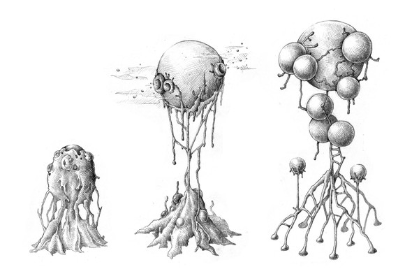 It reminds me of Miyazaki's characters like the black magic creatures (How's Moving Castle) or the black curse (Princess Mononoke). Anyway, very interesting work.