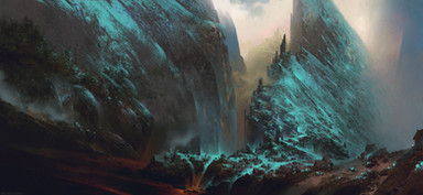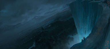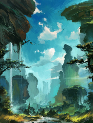 You named it hidden waterfall, yet it seems to me that the bridge, and not the waterfall, is what is hidden. I'm biased towards blue color, so I really like the mix of blue and white for the background. It reminds me of an almost clear blue sky with white puffy clouds. From what I can tell, the sunshine in this image is coming from the left of the image. Did I guess correctly? The repeated white streams of water falling far away blends nicely with the cloudy sky, and streams of white water falling in the foreground. I like how much vegetation there is. It removes the monotony, but doesn't spoil the average blue color. The characters look like they are on an important quest. Good work.