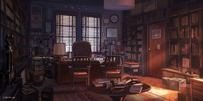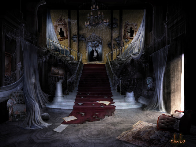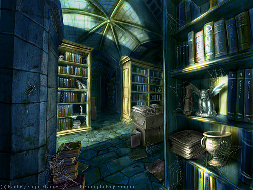 Phantastic!!! I love how you did the long hallway together with the dim light ... and all those books!!! Great work!