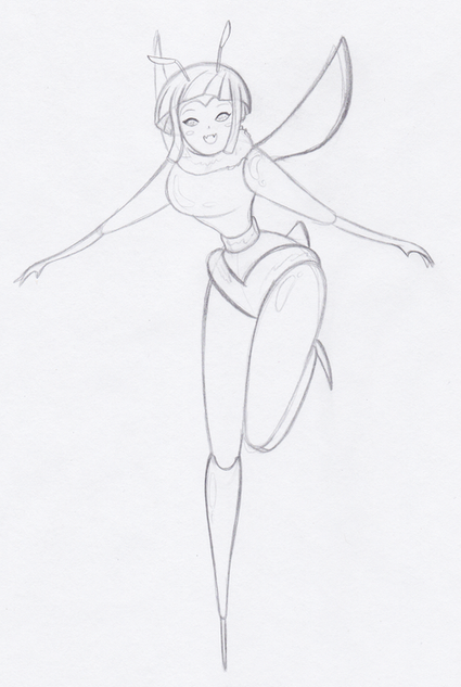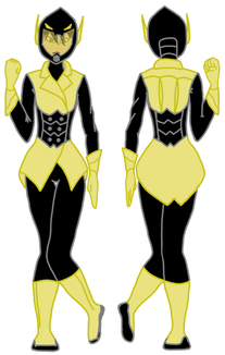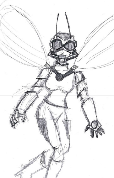 This is my approach on how the Wasp's costume should be if it were more similar to a real wasp ignoring previous costumes, (some) practicity and even her personality (because she wouldn't wear a helmet that covers her whole face). In the back, the jacket has two flaps from where the wings can come out when she shrinks. I'm glad on how turned out in the end. Any question or suggestion, leave it in the commentsPS: I did this drawing on the side of my college notebook so, that's why it's not very detailed. The original size of this drawing is like 2,5x8 cms