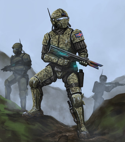 Future Soldat 2040 Ranger ConceptA production model FS2040 robot upgraded to the Ranger variant on field training. Has armour that provides protection against 12.7mm HMG rounds and also carries a 12.7mm assault rifle with a 50 rnd clip. This is the standard colour scheme and can be changed to what is required.