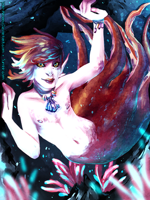 Aha poor merman doesn't seem to happy about spotting a predator eating his snack. Perhaps he will soon be the main meal X3 Beautiful shading as always, his expression looks so innocent XD