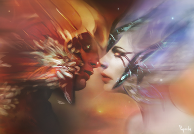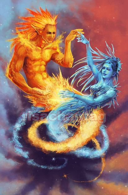 When I saw this I thought f Star Wars The Clone Wars episode when Ahsoka, Obi Wan, and Annie land on a very powerful, strong-in-the-force planet. There was an old man and he had a Daughter: Light/Day Son: Darkness/Evil. Except this particular piece of art looks like they're married. I don't know. That's just my opinion. Excellent work! ;D