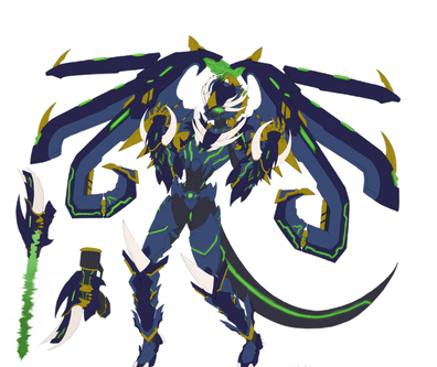 I love how chaotic she looks, especially the gauntlets on her arms, the fangs and claws of different beasts adorning them. The tail is the best though because I totally see not only a snake, but an elephant as well in its design. She's just a real chimeric nightmare.