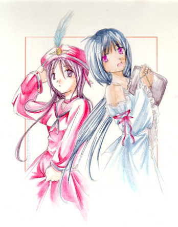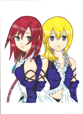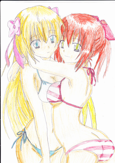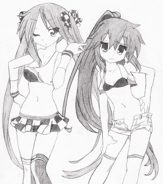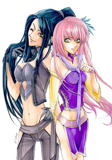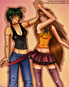 I like this one alot. Very sexy characters. I think you could have paid attention to the girl on the right's hair alittle more. Its good, but I would like to see those ends finished. Also, crop the image for presentation. The characters cut off into a white edge.