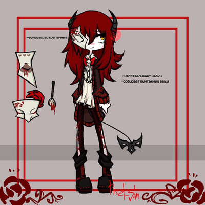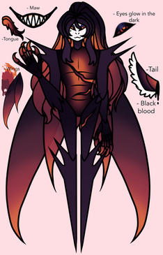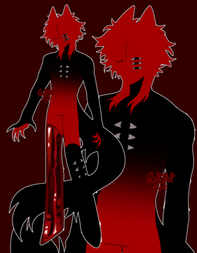 He can take very long and sharp daggers from the palm of your hands that you use to kill or fight, sometimes he uses his outfit 2 where he only covers his neck. His eyes are of an inverted color, his pupil being white and the rest black, and veins appear under his eyes and under his neck.