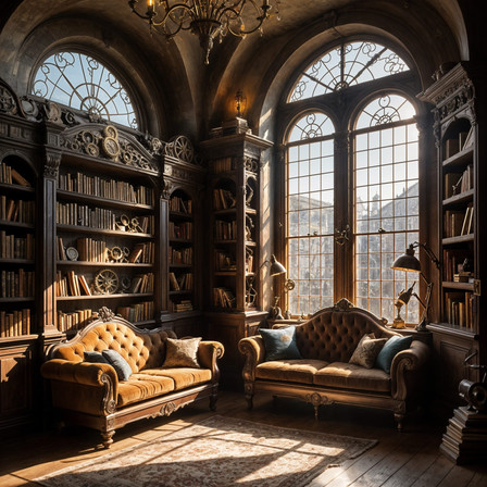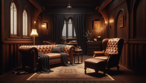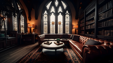 #black #cathedral #coffee #color #confy #crepuscular #forest #interior #medevial #nature #pillows #small #sofa #stainglass #table #warm #wooden #midjourney