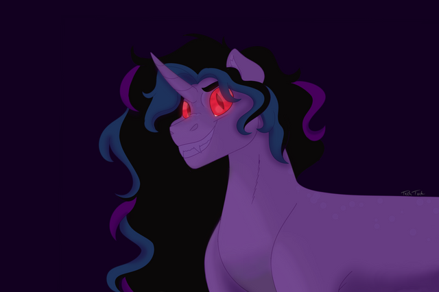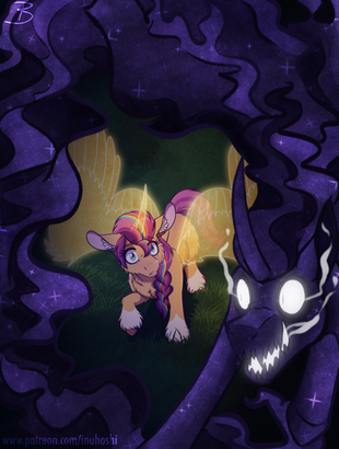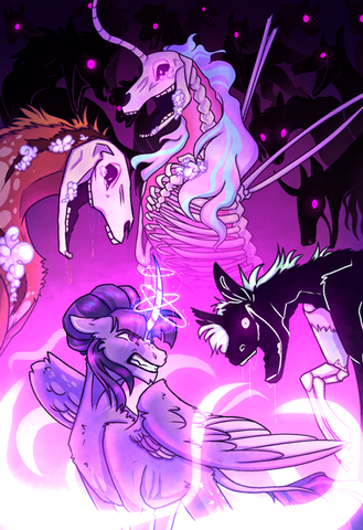Twilight eventually spoke, meekly behind her mother. She told of a pony of darkness, a towering figure that would loom over Celestia herself. The creature’s eyes pierced through the darkness, transfixed on the filly. Her mane would glisten with stars and constellations. Her teeth would chatter together as a thick, raspy laugh echoed from her pipes. Twilight would run or be too stricken with fear to move but it’d always end the same. The creature would flare its wings, horn illuminated and cry out to the filly as it swooped down to her. The voice rattled in Twilight’s ears. And when Celestia asked the filly what this creature spoke, Twilight cautiously uttered…