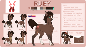 Ruby is a stoic yet vocally reassuring mare. While her tone and use of words can scare others, Ruby is a lovely pony who’s focus is to bring peace of mind and advice. She is very hard to read and does have a aura hanging over her head after multiple incidents.