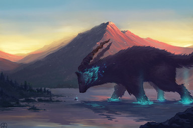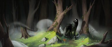 You have a thing for these creepy paintings. I love the contrast between what would otherwise be a peaceful, night forest scene and that shadow creature looming over it. I love the colors of the sky. The gradient between the pinkish, purple and dark blue flows fantastically. Also the creature's eyes and mouth, glowing like that, is a really cool effect. Though the two doe are secondary characters, it's hard to miss them.Β