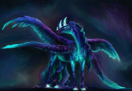 This is really good. I love the contrast between the soft, foggy colors and the nebula like mane of the creature.