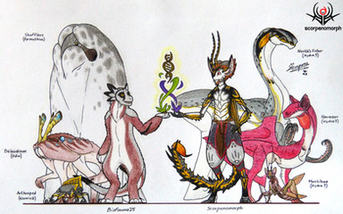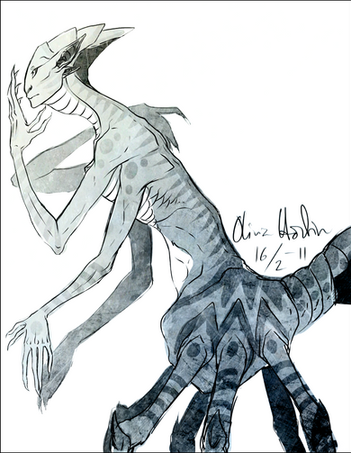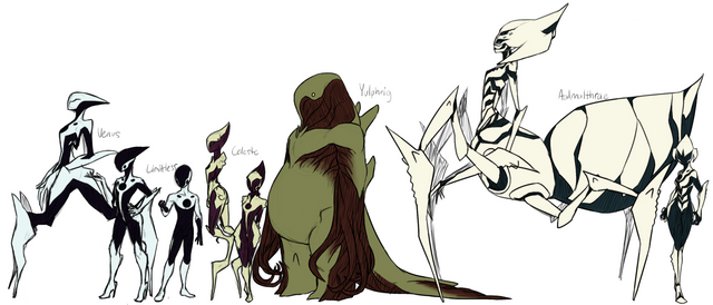I finally drew them all together...! Nevermind that it's just a bunch of coloured sketches. They're all there, and they're all proportionate to each other, and I finally have a (more or less) final design for them all. Loriya's colour scheme is weird af, but she appreared hella pink in the dreams where all these aliens first appeared... I might mute her colours later, we'll see. <_<At some point I'll draw them all wearing their proper clothes as well, but I needed a nekkid ref first;;;;